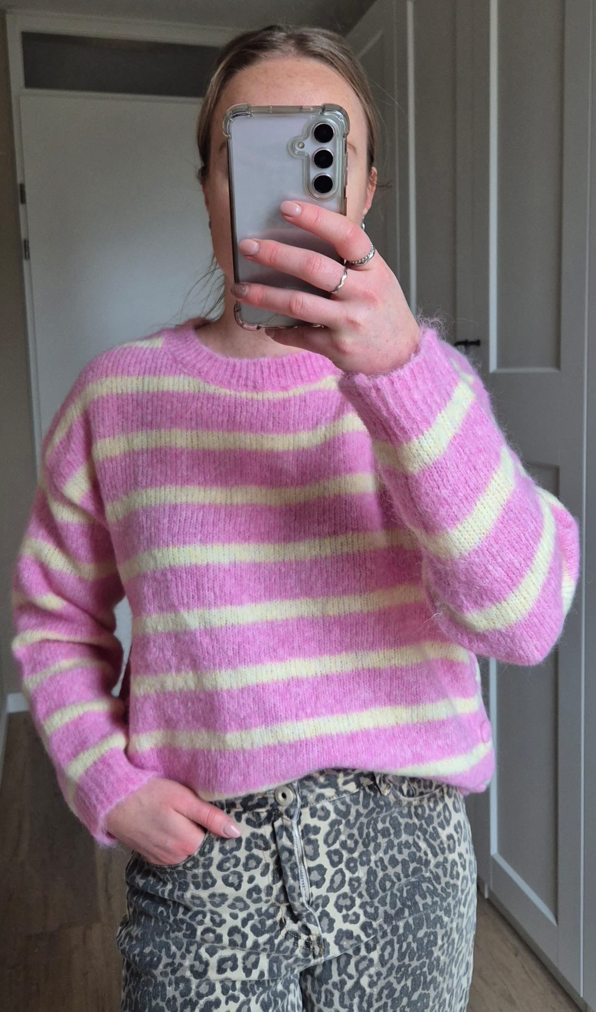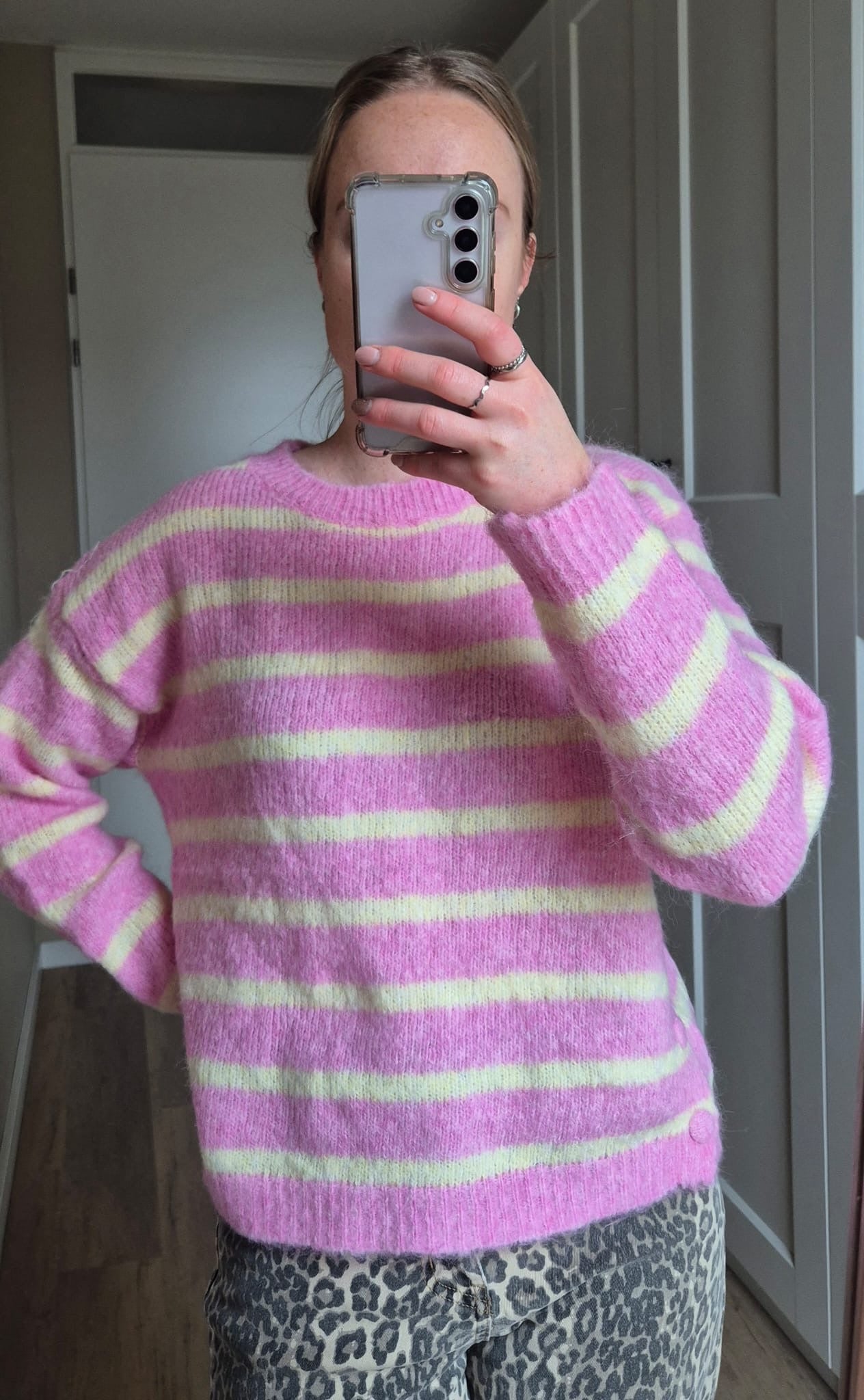 Deze roze gestreepte trui is een fleurige trui voor het voorjaar wat eraan komt. Het is een wolle trui die niet te warm is. Het is een one size en is te dragen tot XL. Dus dit is zeker een topper voor aankomende periode.