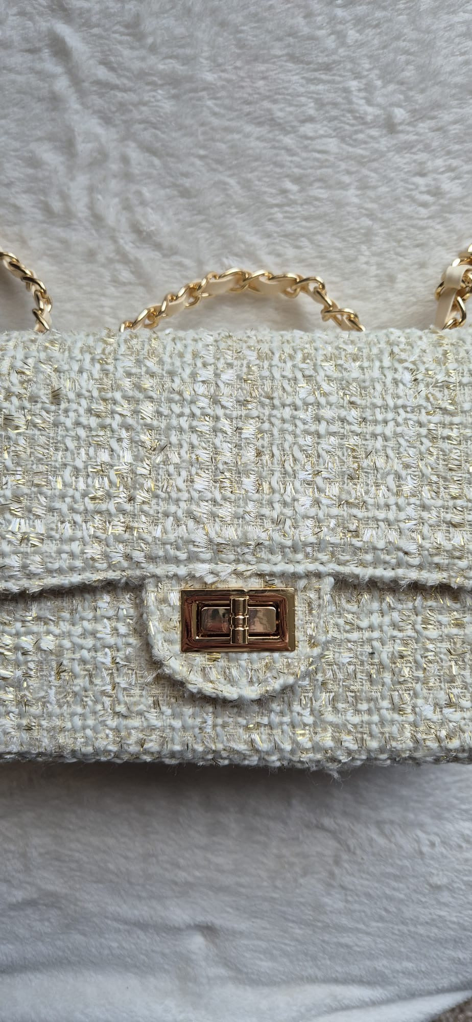 Dit leuke witte tasje is een klein tasje voor om je nek. Ideaal voor je spulletjes die je bij je hebt in te doen. Hij heeft een goude knoopsluiting en de ketting voor om je nek is ook goud.